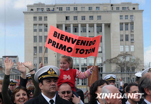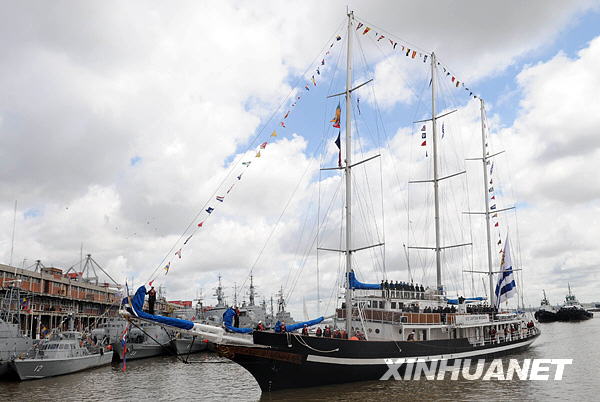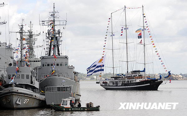 10月19日,在乌拉圭首都蒙得维的亚,乌拉圭海军“米兰达船长”号帆船教练舰靠近码头。“米兰达船长”号结束环球航行后于当天返回蒙得维的亚港,受到乌总统巴斯克斯及船员亲属数千人的欢迎。该舰今年3月离开蒙得维的亚,先后访问了阿根廷、巴西、巴哈马群岛、美国、加拿大、爱尔兰、荷兰、西班牙等国。新华社发(尼古拉斯·色拉亚摄)
