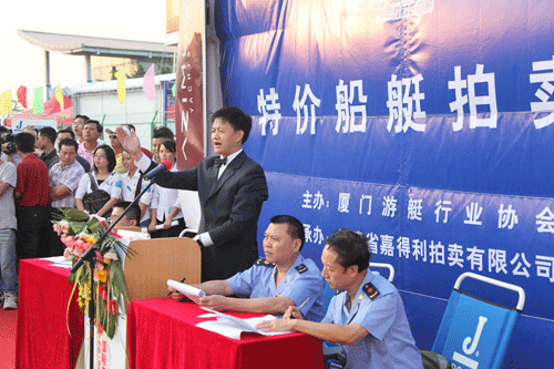 1日下午,在五缘湾举行的特价船艇拍卖会竞价踊跃,与会买家竞相举牌。 |