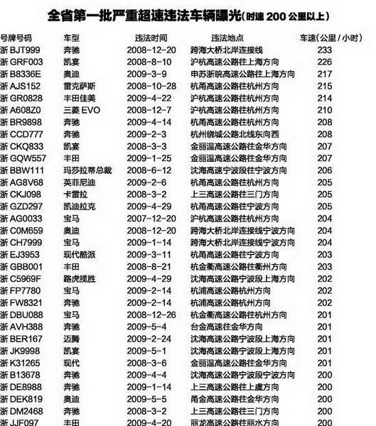 尽管有关部门没有公布这些车辆的更多信息,但记者经过查询发现,其中不少为豪华车。比如位列首批黑名单榜首的浙BJT999,在杭州湾跨海大桥北岸连接线开出233公里/小时的速度,它是一辆奔驰。排名第二的浙GRF003,在沪杭高速开到了226公里/小时,它是一辆凯宴。而排在第六位的那辆三菱EVO,就是文二西路交通肇事案的肇事车。另外,这份名单中的部分车辆,已经在网络上被网友曝光,其中一辆宝马,在2006年至2007年就有30次交通违法行为,其中20次是超速。