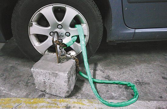 昨天下午,记者来到在城站火车站的地下车库,车子停得挺满。转了一圈,发现不少车子的前轮底下都放着一块大石头,而这块大石头上又有把绿色的粗锁锁住了车轮。记者大体数了一下,这样没有自由的车子有五六辆。