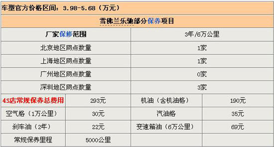 销售网点仅针对对应车型经销商数量,并不反映该品牌当地经销商实际数量之全部。 雪佛兰新乐驰做到油耗与动力的完美平衡,高达52.2KW的升功率超过国家对“节能环保型发动机”50KW的定义,是目前国内市场1.4L排量以下,A00级微轿发动机的最高水平。 雪佛兰乐驰的养护费用在这一次的费用对比中确实比其他车型要高出不少,价格也接近经济型轿车的高度了。但是有鉴于AOO级车型日常仅以代步为主,所以应该还是可以接受的。但是相对偏少的售后服务点,就真的让很多车主感到头痛了。以外形相似而闻名的QQ,在国内的销售维修网络已经相当完善,这也是乐驰在销量上难以企及的因素。