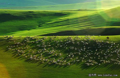 夏季牧羊 三、呼伦贝尔草原 呼伦贝尔草原位于大兴安岭西侧,东西300公里,南北200公里,面积约10万平方公里。呼伦贝尔大草原是中国目前仍保持完美(没被污染)的草原之一。 1、金帐汗部落 金帐汗蒙古部落坐落在陈巴尔虎旗境内,是呼伦贝尔境内唯一以游牧部落为景观的旅游景点,位于呼伦贝尔草原上号称“北疆第一曲水”的莫尔格勒河畔,是呼伦贝尔三大草原旅游点中景色最美的一个,离海拉尔约40分钟车程。这里是中外驰名的天然牧场,也是“天苍苍,野茫茫,风吹草低见牛羊”的呼伦贝尔草原腹地。12世纪末至13世纪初,一代天骄成吉思汗曾在这里秣马厉兵,与各部落争雄,最终占领了呼伦贝尔草原。金帐汗部落景点的布局,就是当年成吉思汗行帐的缩影和再现。 金帐汗蒙古部落距海拉尔市区38公里,可乘去往拉布大林方向的班,告诉司机在“金帐汗”下车,车会停在公路边,下车再往西走800米左右就是金帐汗。也可乘出租车前往。 2、呼和诺尔 呼和诺尔草原在呼伦贝尔盟陈巴尔虎旗,坐落在呼和诺尔湖畔的高岗上,距海拉尔市约54公里,是呼伦贝尔草原的一部分,也是当地最具代表性的草原民俗旅游点。乘海拉尔去往满洲里方向的长途汽车,在301国道1340公里里程碑处下车,向北走500米即是。也可乘出租车前往,人多的话租车去陈旗或进草原是很好的选择。海拉尔有到各旗的车,到陈旗的尤其多,每20分钟就有一趟。 草原内有许多大大小小的河流湖泊,其中呼和诺尔湖景色最佳,湖面四周绿草如茵,湖水清澈洁净,犹如一颗闪亮的明珠,湖边不时有野生的白鹭飞起,岸边不时有只会往前而不会拐弯的青蛙跳起跳落。夏季草原上水草丰美,牛羊遍野,蓝天白云下,景色异常优美。在草原上,你可以住在蒙古包中,真正体味一下蒙古民族特有的风情。 3、巴彦胡硕敖包山 呼伦贝尔境内另外一个草原旅游点是巴彦胡硕敖包山旅游点,隶属鄂温克自治旗,位于敖包山南部伊敏河畔的岗阜上,距海拉尔39公里。 建议租车从海拉尔到鄂温克旗的白音呼硕草原,毕竟,风景都在路上。全程只需20分钟,出租车费用在50元左右。 4、说明 在旅游点消费相对于呼伦贝尔境内的其他消费来说是比较贵的;去的时候多带点衣物和防蚊用品,草原上早晚温差很大,蚊子种类也很多,有一种毒蚊子非常厉害,最好作些准备。