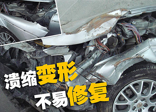剧烈的撞击使得这辆银色的名爵MG7车头损毁严重,发生了变形溃缩。保险杠已经完全脱落,右侧车门被划开了一道口子,维修难度比较大。