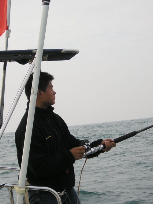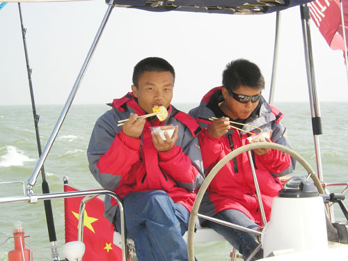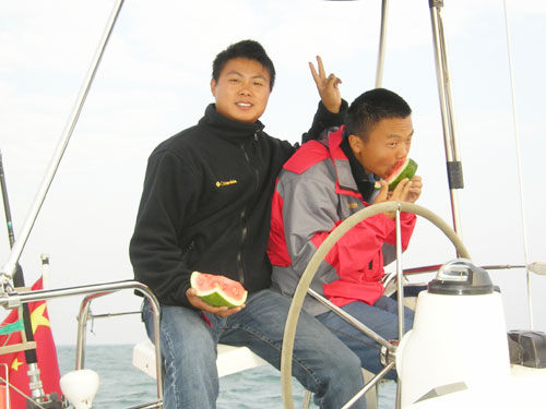 水手日志:从珠海到海口:海豚和4、5米高的海浪!领队桂花鱼,写于11月26日 海口 24日,昨天的拍摄结束,我们就马不停蹄的采购,贮备到海口的补给。 早上我们8点起床,做好了准备,我们出发了。 海上吹着15、166节的东北季风,很适合骑士号的航行。刚刚出发走了没多久,就发现了几条白色的海豚为我们送行,,几条漂亮的白影在我们船的后方跳来跳去让我们全队的人们都心情大增,让我们感谢这几条漂亮的小家伙给我们带来了快乐。因为速度太快我们也没来的及拍照,真是很可惜! 经过几个小时的航行后,船长王庆发现风浪越来越大。决定暂时停靠位于距离海口还有150海里的上川岛。在上川岛我们吃了一顿地道的广式海鲜大餐。吃完饭找了一家小旅馆我们就住下了。好好休息一晚真是比什么都重要。 25日早上10点我们又开始了往海口的航程。。刚刚出发我们就把骑士号船尾的两个鱼钩放下去了,希望能钓上一两条大鱼来。只不过让我们很失望,等了很久都没有动静。只是海带在看到我们失望的表情后,大声的喊说有鱼上钩了,让我们真的很激动,,船长将船的速度减到最小,王疆拿摄像机,大家都很期待!只是海带那边到是没了动静了。原来他是想给我们一点希望,就把我们涮了一下,,让我们失落的半天。 晚上值班的时候,深圳卫视的主持人蒋迪昊珍藏在内心己久的想法终结了.在入夜17点13分的时候写下了人生的第一个漂流瓶,里面写的什么我也没看见,但看出他内心是非常开心的。 26日早上6点,我们进入了琼州海峡,本来稳定的风浪突然变的很大,浪高一下变的有4 ,5米高,搞的我们很是紧张了一下。船长还下令让所有人都穿上救生衣,听青蛙小赵说,,这还是扬帆万里出发以来的第一次。好在只是有惊无险,在闯过海口附近的渔网阵后,下午4点靠好了码头。 骑士号在海口还要停几天,下一站目标是三亚。下图:骑士号新任领队桂红军,绰号 桂花鱼下图:看看,船长王庆怎么吃西瓜的!和八戒师兄一个样啊!下图:航海中,桂花鱼在操作骑士号绞盘。下图:水手海带在琢磨啥?美人鱼?下图:吃饭、开船两不误。下图:桂花鱼:兄弟姐妹们啊,怎么一个都不上钩啊?!下图:一向顽皮的水手青蛙突然有些妩媚。