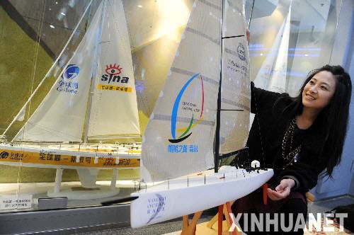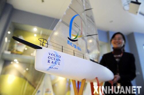 12月30日,青岛站组委会工作人员正在展示沃尔沃环球帆船赛帆船模型。2009年1月28日前后,参加2008-2009沃尔沃环球帆船赛的7艘大帆船将驶抵青岛,青岛被确定为本次比赛第五赛段的起点。沃尔沃环球帆船赛是目前世界上顶级的专业航海体育赛事。新华社记者李紫恒摄