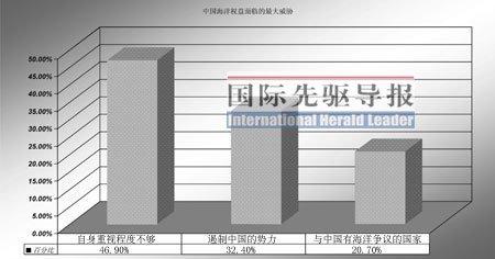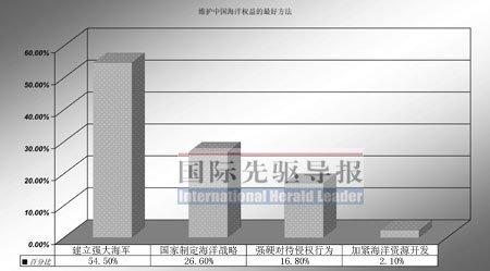 威胁一定程度来自自身 近年来随着科技的发展和海洋开发进程的加快,中国同周边国家的海洋权益国家纠纷日益加剧。那么,中国海洋权益的真正威胁来自哪里? 调查显示,53.1%的受调查者认为威胁来自外部,其中32.4%的受调查者认为威胁来自“担心和遏制中国强大的势力”,20.7%的受调查者认为威胁来自“与中国有海洋划界争议的国家”。46.9%的受调查者认为中国海洋权益面临的最大威胁来自于自身的重视程度不够。 郁志荣则同意后一种观点,海权意识是加强海洋管理的前提和原动力,“对中国海权最大的威胁来自我们自己,来自我们海权意识的淡薄”。 “海洋不但有丰富的资源,更系有国家的安全。所以,要有强硬的态度来维系海权。绝不妥协”、“中国不称霸,但更不能允许他国在我国土称王称霸!”在调查中,记者发现大多数受调查者认为,中国应该以强硬的态度对待它国侵犯中国的海权的行为,但并不主张对外扩张以谋求海外霸权。 对海洋维护现状不满 调查结果显示,高达90.4%的受调查者表示对中国海洋权益维护的现状不满。调查发现,受调查者最为关注南海争端,“按照50年的期限,在2020年9月前,如果中国不能控制这些岛屿的话,将意味着主动放弃对它们的主权”。 受调查者的担心并非杞人忧天。国防大学的孟祥青教授就指出,在中国300万平方公里的海域中,近一半存在着争议:海域被分割,岛礁被侵占,资源被掠夺的情况非常普遍。中国版图上划的海上传统疆界‘九段线’早已名存实亡。8个海洋邻国均不同程度地对我海洋国土和权益提出了无理要求,这涉及100多万平方公里的海域。 至于维护中国海洋权益的途径,54.5%的受调查者主张“建立强大的海军和统一高效的准军事力量”是维护中国海洋权益的最好方法,26.6%的受调查者认为“国家需要制定明确的海洋战略”。因此,中国海军的建设,尤其是航母的建造备受关注。 当然,也有极少数受调查者指出应该“建立强大海军打垮周边侵权国家”。对此,杨毅认为,中国维护合法的海洋权益固然需要发展强大的海军,但提高海权意识、解决领海争端并不意味着武力对抗,过于强调武力手段,将加剧地区安全困境。也有部分受调查者认为,除了发展海军,维护海洋权益还需要制定明确的海洋战略、加强海洋资源开发等综合手段的运用。