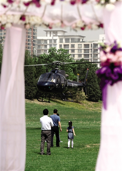 昨日上午,京城首次直升机迎亲在东四环某公馆内上演,为这一新兴的航空业务拉开序幕。据了解,该次飞行花费5万元,由专业航空公司提供服务。
