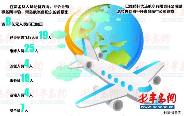 在资金及人员配备方面,经会计师事务所审验,青岛航空各股东的首期出资8亿元人民币已缴足,已经招聘飞行人员19人、维修人员25人、签派人员4人、乘务员18人、运输人员4人、安全员7人,已经聘任大连航空有限责任公司原总经理刘剑平任青岛航空公司总裁。在正式向民航局申请公共航空运输企业经营许可证之前,民航华东地区管理局已完成对其初审。据了解,申请公共航空运输企业经营许可证是新的航空公司开飞前的重要步骤,此次公示将持续至3月6日,也就意味着,青岛航空最快将于下月起飞。
