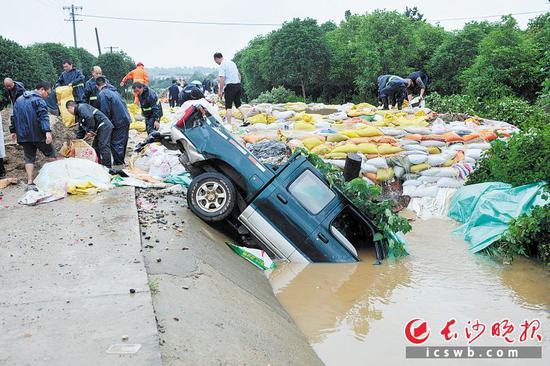 2日上午,由于排洪渠出现管涌,刘兵紧急将自家皮卡车推入水中阻挡水势,并在后方用砂石袋垒出临时围堰,堵住管涌。长沙晚报记者王志伟摄 2日,一段视频在长沙县广大党员的手机里被刷屏:一辆驮着巨石的蓝色皮卡车停在渠边,随着一声“一二三,推!”的声音响起,五名村民一起将皮卡车推入湍急的排洪渠中。据了解,车的主人是长沙县黄兴镇仙人市村支书刘兵,在浏阳河水倒灌排洪渠的紧急关头,他下令将自己的车推下排洪渠,以堵住管涌。 记者闻讯后第一时间赶到现场。在仙人市村曹家园组和邵家湾组间的村组道路旁,驮着石料的这辆皮卡车一头扎在水渠的泥浆里,顽强地坚守着它的“新岗位”。在其后方,抢险队员们用砂石袋垒出一个10多平方米的临时围堰。而在围堰约100多米远的地方就是浏阳河,湍急的河水已经高出了河堤。 “仙人市村100多名党员已经全部上堤。紧急时刻,顾不上考虑别的,身后就是100多户村民的房屋和林地,阻止险情扩大是首位。”刘兵在泥浆砂石堆里指挥加固围堰,他和村里的党员、干部一起,从前晚12时开始坚守在堤边。他简要向记者介绍了当时的情形:上午7时许,仙人市村浏阳河桐车闸被洪水冲坏,河水倒灌进排洪渠,路基出现管涌险情。雨越下越大,涌向村民住房、稻田,花木场的水也越来越多。“我们组织人几次尝试用加厚木板堵住管口都无法阻挡水势。”刘兵说,当时一下子无法调集足够的砂石堵漏,而他的皮卡车就停在路边,情急之下他和村民一起将车推下湍急水渠阻挡水势。随后,他们迅速调集砂石现场装袋,建起临时围堰。 “这辆车跟我几年了,现在基本算是报废了,算是最后一次做贡献吧。”刘兵回头看了看自己的爱车,就带着几名党员赶到堤边另一个闸口抢险。 下午6时许,雨仍然没有停。“围堰开始溢水了!”有人喊道,刘兵和值班党员们立即冲上来。记者看到,河水已经从围堰顶部的沙袋缝隙开始流出。“一部分人留在这里继续加固围堰,你们几个跟我走,去疏散还没有撤离的10多户群众。”刘兵振臂一呼,几名党员跟随他跳上几辆汽车飞驰而去…… |