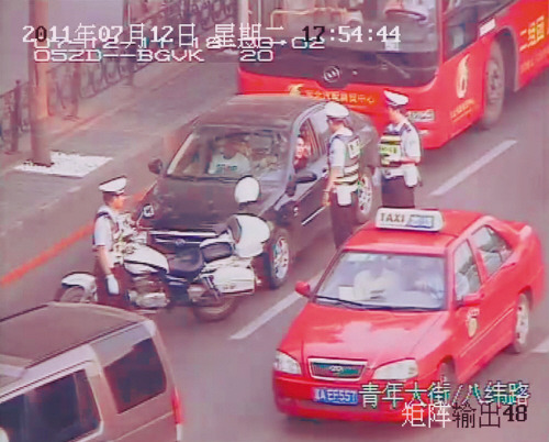 “一辆黑色赛拉图轿车连撞交警和摩托车,现正向市府广场方向驶去,车号是……,请帮助拦截。”交警张亮在青年大街市府南岗执勤,手台声音刚停,就见“赛拉图”出现在路口。