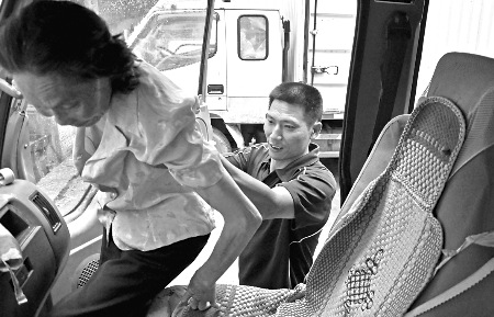 潼南县,周会明扶着患有精神分裂症的母亲张永秀上车。记者 蒋雨龙摄 如果没有旁人提醒,40岁的潼南男子周会明还没意识到,老母亲已经在他的货车副驾驶位置上坐了13年。因为母亲患有严重的精神分裂症,身为货车司机的周会明每次跑运输时,都会把母亲带在身边。“母亲是我的负担,但更是我的幸福。”昨日,孝子周会明向记者回忆起了13年来的酸甜苦辣…… 细心 想法让车上风扇对着母亲吹 昨日,潼南县车队的场地上停放着许多大货车,40岁的周会明正拉着73岁的母亲张永秀寻找着自家的车子。“妈妈总是比我先一步找到,她对货车的熟悉程度比我强,喜欢这个车子甚至超过了喜欢我的家。”周会明告诉记者。 只要不下雨,周会明就要带着母亲跑业务。看到家门一打开,张永秀就会很开心地在前面拉着儿子大步流星找到自家的货车。“你推我一把。”张永秀一只脚踏进货车,在儿子的支撑下,麻利地钻进了车子,爬到副驾驶的座位上稳稳当当地坐下,然后心满意足地催促着儿子上车。 气温近40度的车厢里没有空调,只有一台小风扇,虽然安置在方向盘旁边,但周会明总是想方设法让风扇对着母亲的方向吹。冬天怕车里太冷,周会明还在座位的后排“开辟”了一排窄小的空床位,上面铺着厚厚的棉絮和被子。“妈妈很喜欢爬到后面睡觉,她已经不用我帮忙,就会用被子把自己裹得严严实实。” 休息好了的张永秀又会爬到副驾驶的位置上,比划着和儿子不停地说话:谁家盖了新房子,谁的手又摔伤了…… “她说的话我基本都听不懂,她的思维是错乱的,每天却自顾自地说不停。”周会明说,但是自己每次还是微笑地听母亲说,有时他还要插两句嘴,像模像样地评论一番。 孝心 担心 母亲屡走失 决定带在身边 周会明出身于农民家庭,25岁时学会了开车,之后便一直在跑货运。1998年,母亲张永秀突然晕倒,在医院里被检查患有严重的精神分裂症。 “母亲精神出现异常,我首先想到的是以后谁来照顾她。”周会明说,虽然几个兄弟姐妹都住在潼南,但他们各自有自家的难处,所以照顾母亲的重任还是继续落在自己的头上。“我是长子,17岁进城后母亲就一直跟着我过,所以我会给母亲养老。”周会明向亲属们保证。 不过,当时周会明的家条件并不好:儿子即将上小学,妻子每天还要在外面摆摊做生意。“开始时,母亲由妻子杨春蓉照看了几天,但因为生意忙,母亲总是在杨春蓉没注意的时候跑丢。” 昨日,杨春蓉告诉记者,每次母亲走丢,周会明都会非常焦急,“好多次没日没夜地在外面找母亲,喊得嗓子都哑了,回来哭着瘫在地上说把母亲弄丢了。” 这样的日子过了两个月,周会明的情绪也在母亲走丢与找到之间大起大落,他不再放心将母亲交给其他任何人。他决定要把母亲带在自己身边,每天带着她一起跑货运。“把她放在一个我随时能够看到的地方,我才会安心工作,否则每天都在焦虑,担心她什么时候又会不见了。” 周会明的邻居和客户向记者证实,周会明几乎每次外出跑运输都会带着他的母亲。 周会明也想过,把母亲送到精神病院或者养老院,但是这些都随即被他否定了。“我不喜欢精神病院里的环境,那里太压抑;后者则不符合老家的风俗。”周会明说,在老家有种说法,没有子女的孤寡老人才被送到养老院,“只有我才能把母亲照顾好,交给其他人都不放心。” “何况母亲如果清醒的话,是不会允许自己在养老院里度过晚年的。”周会明说,母亲在患病之前一直是个很讲面子的人。周会明很小的时候,父母便分开了,两个姐姐出嫁后,他一直和母亲相依为命。“家里穷,我们一直吃不上饭,但母亲从来不允许我出去做很累的体力活,她觉得那样不体面。”周会明说。 有一次,周会明两天没吃饭,晚上母亲突然带回了很多食物,“她说是向邻居借的,实际上是她卖了嫁妆后买来的,她怕向别人借钱不体面。”那些食物张永秀没吃一口,全给了周会明。因为早年过度饥饿,张永秀后来一直患有胃病。 为了母亲舍弃很多生意 自从带上母亲一起跑运输,周会明就有两样活儿不接了:“一个是长途运输,只要出了潼南我就不跑,因为那样母亲会累;还有一样是晚上的活儿,我必须保证晚上能在家里让母亲安心睡觉。” 这样做的后果是,周会明失去了一些客源,收入也少了很多。“此外,母亲每天都强迫我陪她玩‘捉迷藏’。”周会明说,母亲现在的智商和一个5岁的孩子差不多,并且非常任性。 为了保证母亲的安全,周会明每次开车都会将母亲坐的那边的车门锁起来,下车的时候把车窗摇上去。但很多次,张永秀都固执地要求下车,周会明只能把车暂时停下。“她趁我停车时跑下车,一转眼就找不到了。”周会明说,好多次他都是在垃圾堆旁找到母亲。因为路上耽误了时间,他还曾因此向客户赔钱。 有时候为了能让母亲好好休息一下,周会明会在谈生意之前找个地方让母亲坐下来。“结果我一转身,她就跑得没影了,我只能先把生意放在一边,到处去找她。”周会明说,这13年来,母亲像这样跑丢的次数已经不下100次了。他的一个客户、某木材加工厂的老板告诉记者,好多次周会明把母亲弄丢了,他就会跑来请求大家帮忙一起去找。 开心 母亲也会给自己带来快乐 虽然母亲给自己带来很多麻烦,但周会明也有开心的时候。谈生意的时候,母亲总喜欢露出胆怯的神情,紧紧抓住他的手,然后躲到他的背后,有几次
