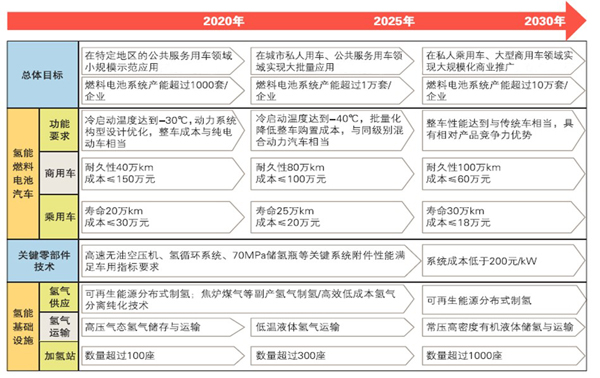 《汽车产业中长期发展规划》制定了汽车产业的总体发展目标,力争在十年的时间内,持续努力迈入世界汽车强国行列。规划中将2020年以及2025年作为时间节点,针对汽车产业的关键技术、全产业链、中国汽车品牌、新型产业生态、国际影响力以及绿色发展水平做出了6个细化目标。同时,为了支撑和实现6项重点任务,《规划》提出建设包括创新中心建设工程、关键零部件重点突破工程、新能源汽车研发和推广应用工程、智能网联汽车推进工程、先进节能环保汽车技术提升工程、“汽车+”跨界融合工程、汽车质量品牌建设工程、海外发展工程在内的8个重点工程。 在这份《规划》中,氢燃料电池汽车作为新能源汽车产业发展的战略作用、发展思路、规划目标和政策导向被再次明确。规划从氢燃料电池的发展技术路线、核心技术攻关、全产业链产业化突破及燃料电池汽车商业化示范等方面指明了发展方向。 1、《规划》确定了我国燃料电池技术发展路线图,为燃料电池汽车产业发展指明了道路。 燃料电池技术发展路线以2020年、2025年及2030年为三个关键时间节点,依据产品研发-制造验证-批量应用的规划思路,使车用燃料电池电堆的性能、寿命、成本三个关键指标依次达到商业化要求,并且完成电堆及关键材料的批量制造能力建设,满足燃料电池汽车发展需求。